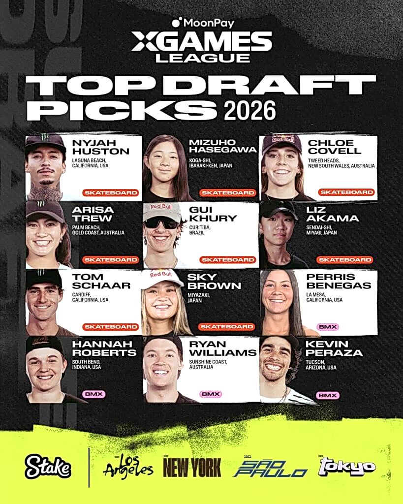 During Thursday’s draft, the four club general managers — Sharalee “Haze” Hazen (XC Los Angeles), Steve Rodriguez (XC New York), Bob Burnquist (XC São Paulo), and Harumi Suzuki (XC Tokyo) — will select 40 athletes from a pool of 180 who opted in across five rounds of eight selections. The draft order, determined earlier this month through a randomized lottery with the general managers present, is set as: XC New York, XC Los Angeles, XC Tokyo, and XC São Paulo.